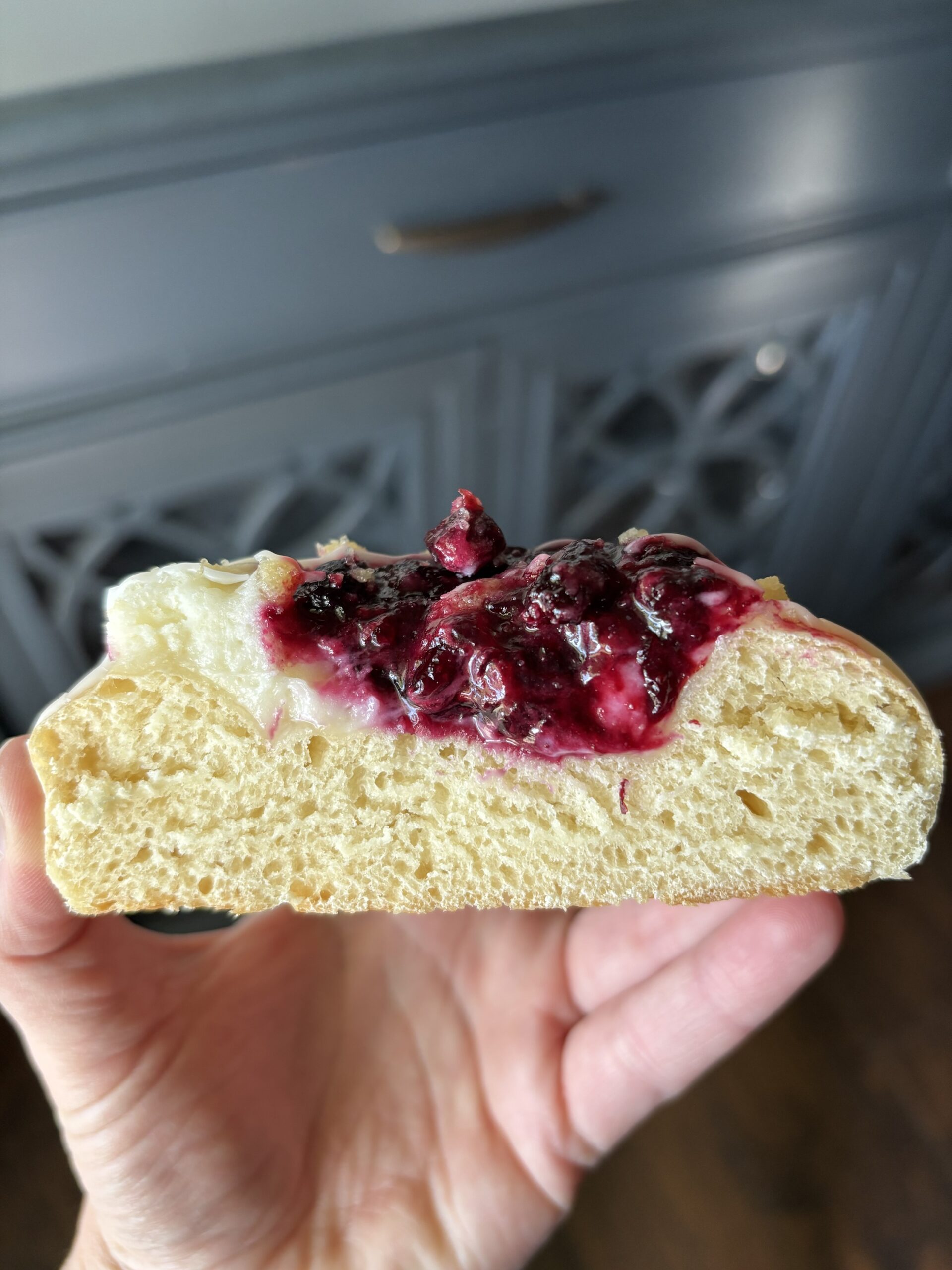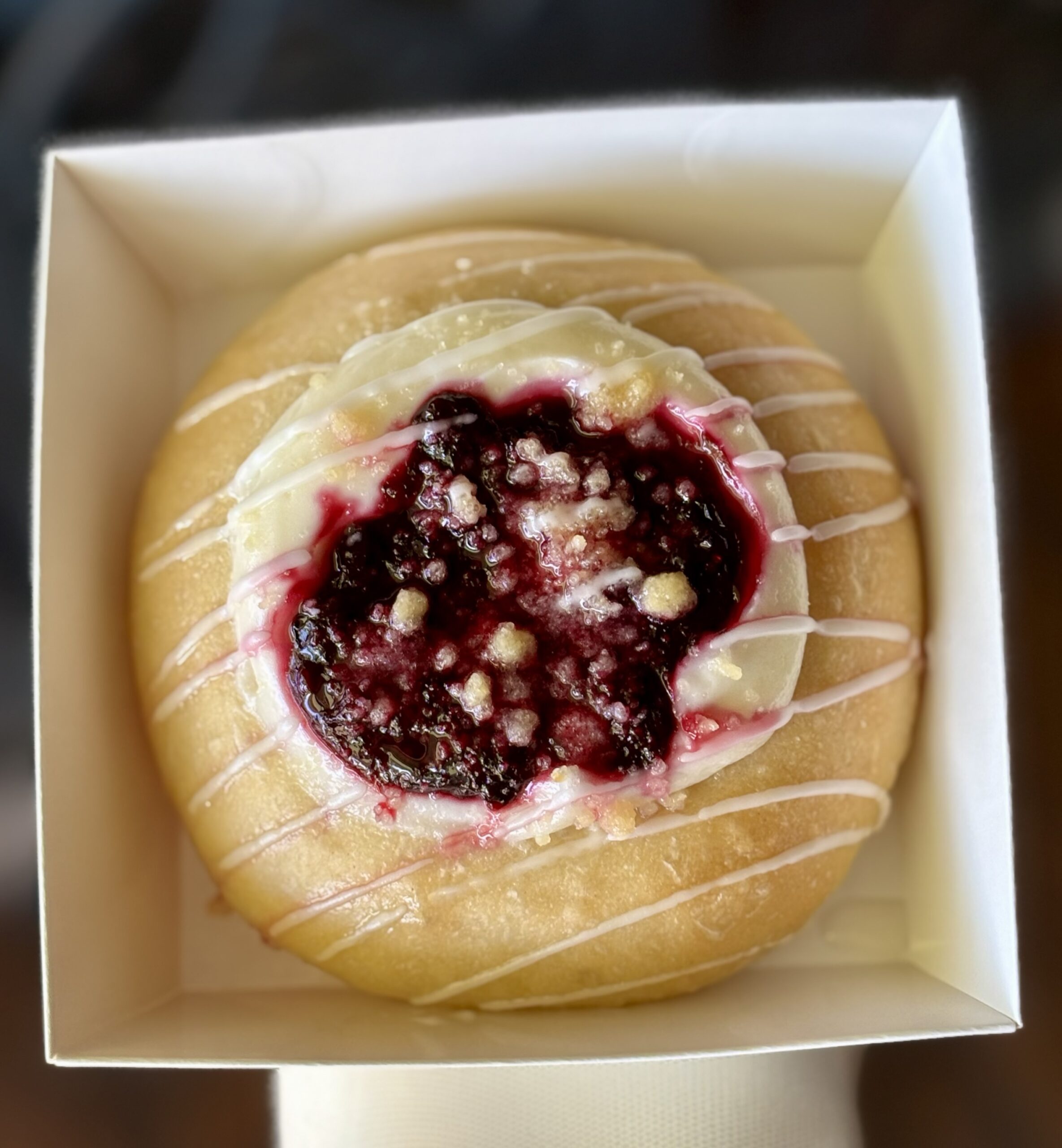 A delightful twist on a classic Czech pastry, our Huckleberry Kolache features a soft, pillowy organic sourdough brioche made with real European butter and organic pasture raised eggs. At the center lies a creamy base with a generous spoonful of wild huckleberry filling—tangy, sweet, and bursting with flavor. Topped with a lemon crumble, baked to golden perfection, and lightly drizzled with a pure vanilla glaze. This treat is the perfect balance of tender pastry and vibrant fruit. Ideal with your morning beverage or as an afternoon indulgence.
